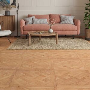 An intricate, interwoven design offers a chic, stylish look for any home. The Galleria Professional Engineered Oak Versailles Flooring 14mm x 600mm Lena Brushed UV Oiled comes with pre-assembled boards, making it easier than ever to bring the charm of Versailles flooring into your space.