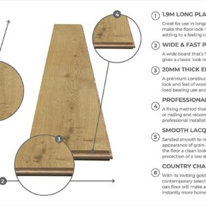 The 190mm wide and long length planks are excellent fits for spacious medium and large sized rooms, especially in traditional family homes where the proportions help to create an all-round well-fitted look. The high-quality multi-layer construction of this floor offers exceptional stability, with 6mm hardwood wear layer complimenting the thick boards for a dense underfoot feel. The traditional tongue-and-groove fixing of this load-bearing floor is best fitted by a professional installer.