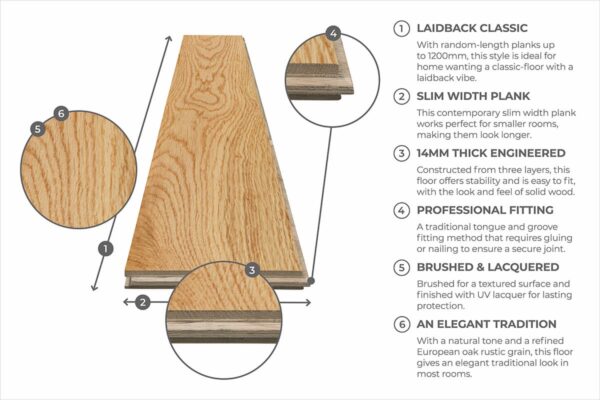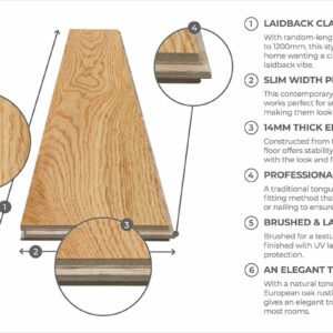 Its 110mm width plank works perfectly in smaller rooms, making them look larger, and the random length planks create a relaxing feel. The brushed UV lacquer provides a strong layer of protection, whilst enhancing the grain texture on this European oak. A real all-rounder that’s both beautiful and easy to care for; simply vacuum and damp mop to keep your floor looking its best. For best results, professional installation is recommended.