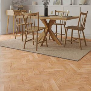 Crafted from high-quality solid oak, this herringbone flooring boasts a smooth texture and a durable UV lacquered finish, making it a hard-wearing option ideal for busy households. The precision-cut planks fit seamlessly together, forming a striking pattern that adds depth and character to your room.
